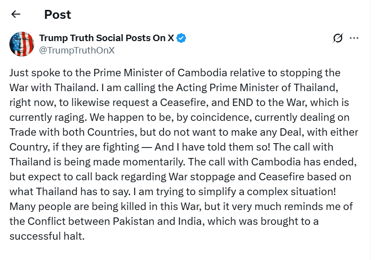 ट्रम्प ने लिखा – दोनों पक्ष तत्काल युद्धविराम और शांति चाहते हैं। मैंने कंबोडिया के प्रधानमंत्री हुन मानेट और थाईलैंड के कार्यवाहक प्रधानमंत्री फुमथम वेचायाचाई से अलग-अलग बात की है। थाईलैंड के कार्यवाहक प्रधानमंत्री फूमथाम ने डोनाल्ड ट्रंप की बातचीत को सराहा और फेसबुक पोस्ट में लिखा कि वे युद्धविराम के पक्ष में हैं।