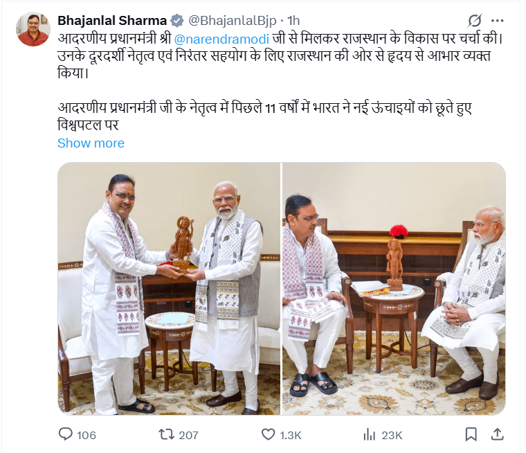 पीएम मोदी से मुलाकात के बाद मुख्यमंत्री भजनलाल शर्मा ने अपनी एक्स पोस्ट में लिखा, ‘प्रधानमंत्री नरेंद्र मोदी से मिलकर उनके दूरदर्शी नेतृत्व एवं निरंतर सहयोग के लिए राजस्थान की ओर से आभार व्यक्त किया। पीएम मोदी के नेतृत्व में पिछले 11 सालों में भारत ने नई ऊंचाइयों को छूते हुए विश्वपटल पर अग्रणी राष्ट्र के रूप में स्वयं को स्थापित किया है। उनके कुशल मार्गदर्शन में पिछले डेढ़ वर्ष से राजस्थान निरंतर विकास की सभी बाधाओं को पार करता जा रहा है और नई ऊंचाइयां छू रहा है।