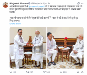 हमारी डबल इंजन की सरकार लगातार राजस्थान को एक आदर्श राज्य बनाने की दिशा में कार्य कर रही है, जहां प्रत्येक किसान, युवा, महिला, गरीब और वंचित वर्ग को न्याय मिल रहा है और वे अपनी पूर्ण क्षमता के साथ सम्मान युक्त जीवन जी रहे है। पीएम ने आने वाले समय में राजस्थान को और अधिक सहयोग देने का आश्वासन दिया है, जिसके लिए उनका समस्त राजस्थानवासियों की ओर से कोटिशः आभार!’