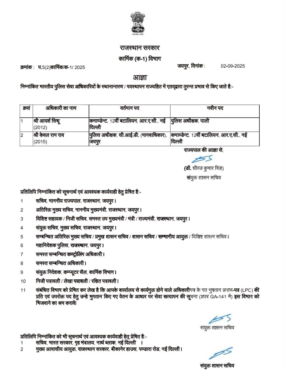 कार्मिक विभाग ने आदेश जारी कर दो IPS अधिकारियों के तबादले किए हैं। अधिकारियों को तुरंत प्रभाव से नए पदों पर कार्यभार संभालने के निर्देश दिए गए हैं। आईपीएसअधिकारी आदर्श सिधू को कमांडेंट, 12वीं बटालियन, RSC से पुलिस अधीक्षक (SP) पाली तैनात किया गया। आईपीएस अधिकारी केवल राम राव को पुलिस अधीक्षक, CID (मानवाधिकार), जयपुर से कमांडेंट, 12वीं बटालियन, आरएससी लगाया गया।