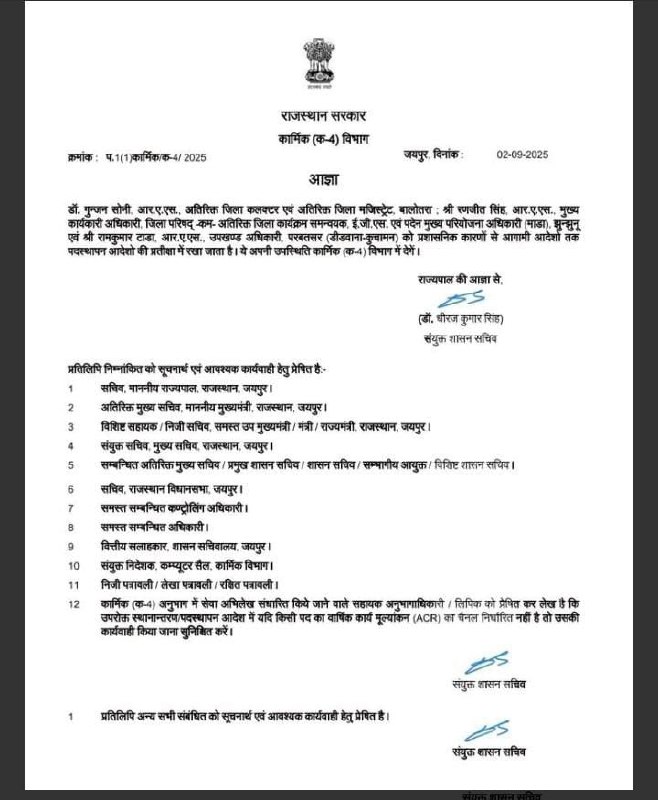 तीन RAS अधिकारियों को आगामी आदेश तक उनके पदस्थापन आदेशों की प्रतीक्षा में रखा है। इस आदेश के तहत डॉ. गुंजन सोनी, रणजीत सिंह और रामकुमार टाडा को APO किया गया है। गुंजन सोनी पहले बालोतरा ADM थे, वहीं रणजीत सिंह जिला परिषद झुंझुनूं सीईओ थे। जबकि रामकुमार टाडा परबतसर SDO पद पर तैनात थे। कार्मिक विभाग ने कहा है कि इन अधिकारियों के पदस्थापन आदेश अगले आदेश तक रोक दिए गए हैं।
