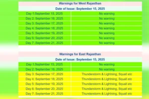 इसके अलावा सोमवार को मौसम विभाग जयपुर के अपडेट के अनुसार 15 सितंबर को पश्चिमी और पूर्वी राजस्थान में किसी भी तरीके का आलर्ट जारी नहीं किया गया है. वही दूसरी तरफ पूर्वी राजस्थान में 17 सिंतबर से येलो अलर्ट जारी किया गया है, जिसके तहत रतपुर, अलवर, जयपुर, दौसा, टोंक और धौलपुर के आसपास के इलाको हल्की से मध्यम बारिश होने की संभावना जताई गई है.