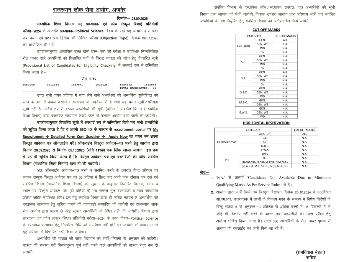 राजस्थान लोक सेवा आयोग (RPSC) ने स्कूल लेक्चरर भर्ती 2025 में सख्त नियम लागू किया है, जिसके कारण कई अभ्यर्थी अयोग्य घोषित किए गए। आयोग के अनुसार, विज्ञापन में स्पष्ट निर्देश दिए गए थे कि यदि परीक्षा में किसी अभ्यर्थी ने 10% से अधिक प्रश्नों में पांच विकल्पों में से कोई विकल्प नहीं चुना, तो उसे अयोग्य घोषित कर दिया जाएगा। इस नियम के तहत 386 अभ्यर्थियों को अयोग्य ठहराया गया। RPSC ने इन अभ्यर्थियों के रोल नंबर अपनी आधिकारिक वेबसाइट पर अलग से जारी किए हैं।