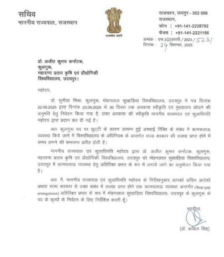 इस बीच, उनके स्थान पर महाराणा प्रताप कृषि एवं प्रौद्योगिकी विश्वविद्यालय, उदयपुर के कुलगुरू प्रो. अजीत कुमार कर्नाटका को एमएलएसयू के कुलगुरू का अतिरिक्त प्रभार सौंपा गया है। राज्यपाल की ओर से इस संबंध में आदेश भी जारी कर दिए गए हैं।