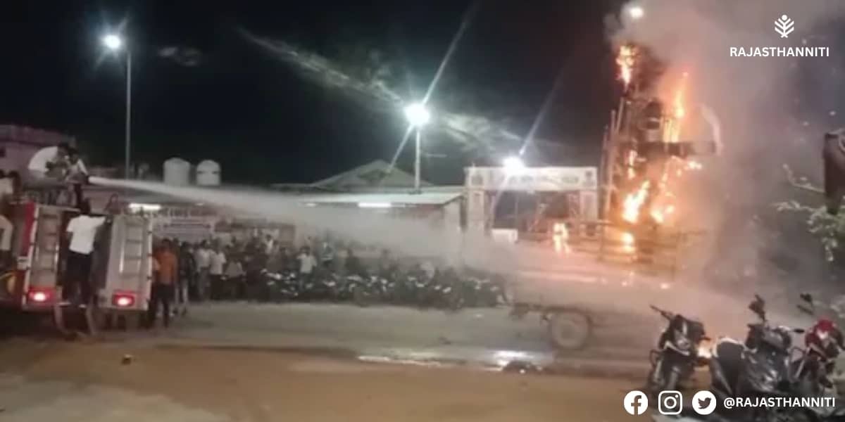 जयपुर ग्रामीण के शाहपुरा में दशहरे के मौके पर रावण पुतले को दशहरा मैदान में लाया जा रहा था, लेकिन बीच रास्ते में वह अचानक आग की लपटों में घिर गया। पुतला ट्रैक्टर पर धूं-धूं कर जल उठा, जिससे अफरा-तफरी मच गई और लोग इधर-उधर भागने लगे।
