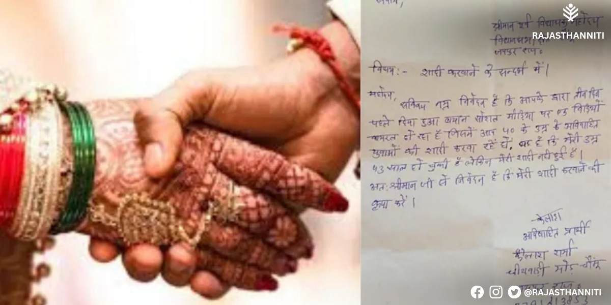 राजस्थान के चौमूं क्षेत्र से एक दिलचस्प मामला सामने आया है, जिसने सोशल मीडिया पर व्यापक चर्चा छेड़ दी है। यहां 43 वर्षीय व्यक्ति ने पूर्व विधायक रामलाल शर्मा को एक पत्र लिखा है, जिसमें उसने अपनी शादी कराने की विनम्र प्रार्थना की है। पत्र में युवक ने लिखा, “मेरी उम्र 43 वर्ष हो चुकी है, कृपया मेरी शादी करवाने की व्यवस्था की जाए।” यह अनोखी गुहार सोशल मीडिया पर तेजी से वायरल हो गई और लोगों के बीच चर्चा का विषय बन गई। पत्र में उस वायरल वीडियो का भी उल्लेख किया गया है, जिसमें पूर्व विधायक रामलाल शर्मा ने 40 वर्ष से अधिक आयु के अविवाहित व्यक्तियों की स्थिति पर टिप्पणी की थी।